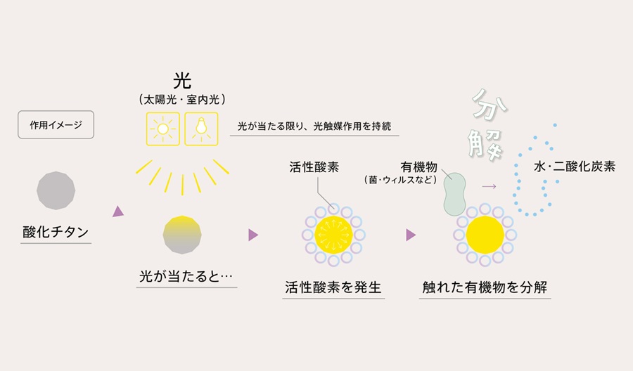 酸化チタンは、太陽光や蛍光灯、LEDなどの紫外線を吸収することで強い光触媒作用を発揮します。