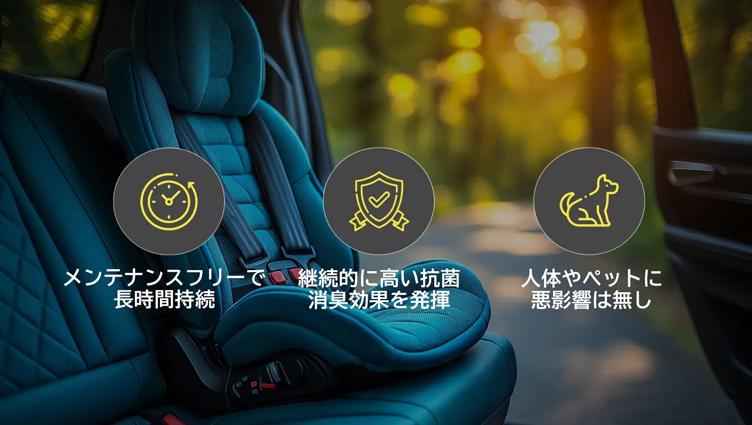 消臭・抗菌・抗ウイルス・抗カビ・揮発性有機化合物除去・紫外線防御。最新の光触媒技術を使用した車内専用の抗菌・消臭コーティングです。光が当たることで活性化し、有害物質を分解する特殊なコーティング剤により、車内を清潔に保ちます。